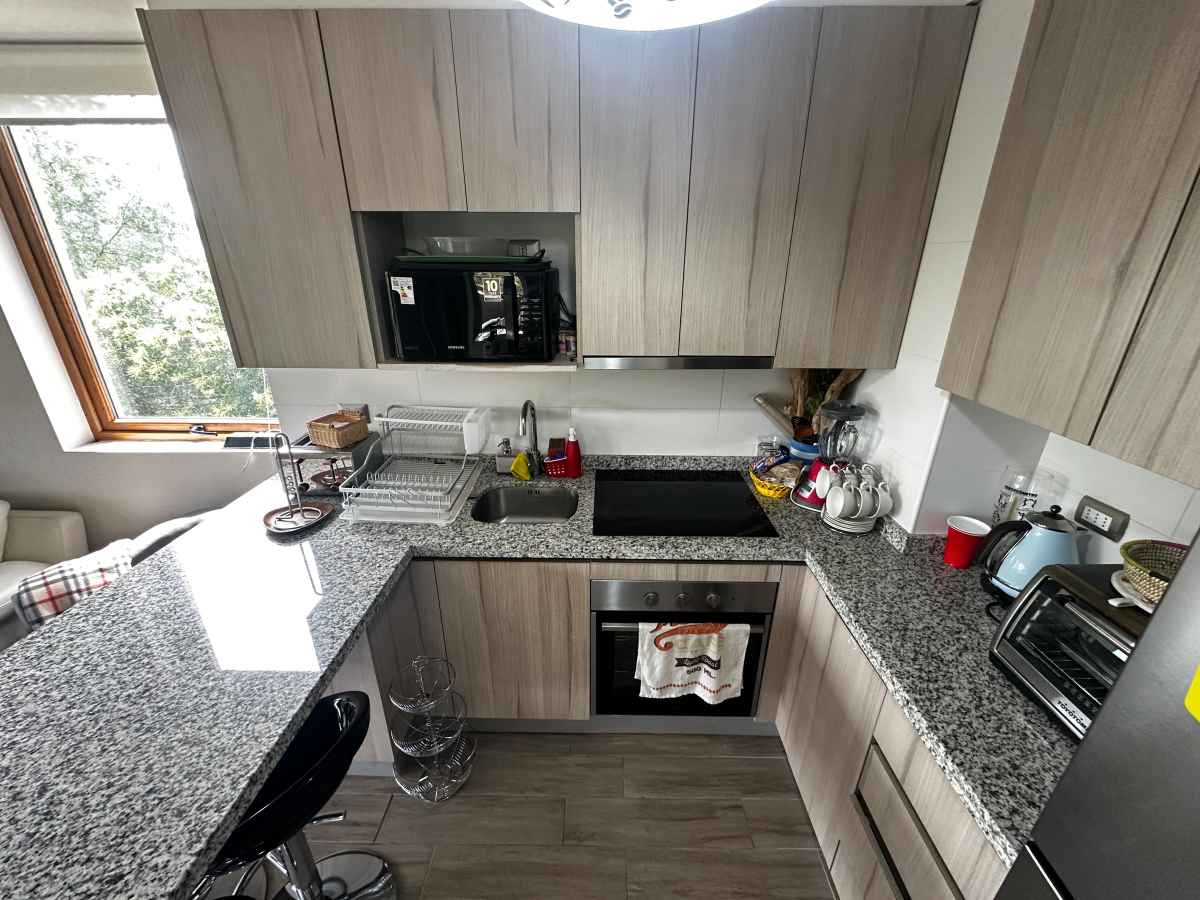 •Cocina con cubierta de marmol, encimera eléctrica de 3 platos y horno empotrado
